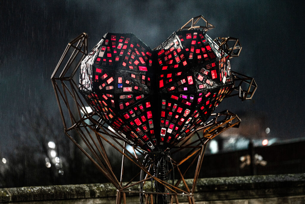 Acclaimed Tees Valley artist Stuart Langley has been commissioned to create a striking new public artwork titled ‘hold me and show me you love me’ – installed at Middlesbrough Railway Station in mid September 2025 – pictured above. This ambitious piece, incorporates donated old mobile phones as a core component of its design and collaboration with the public.