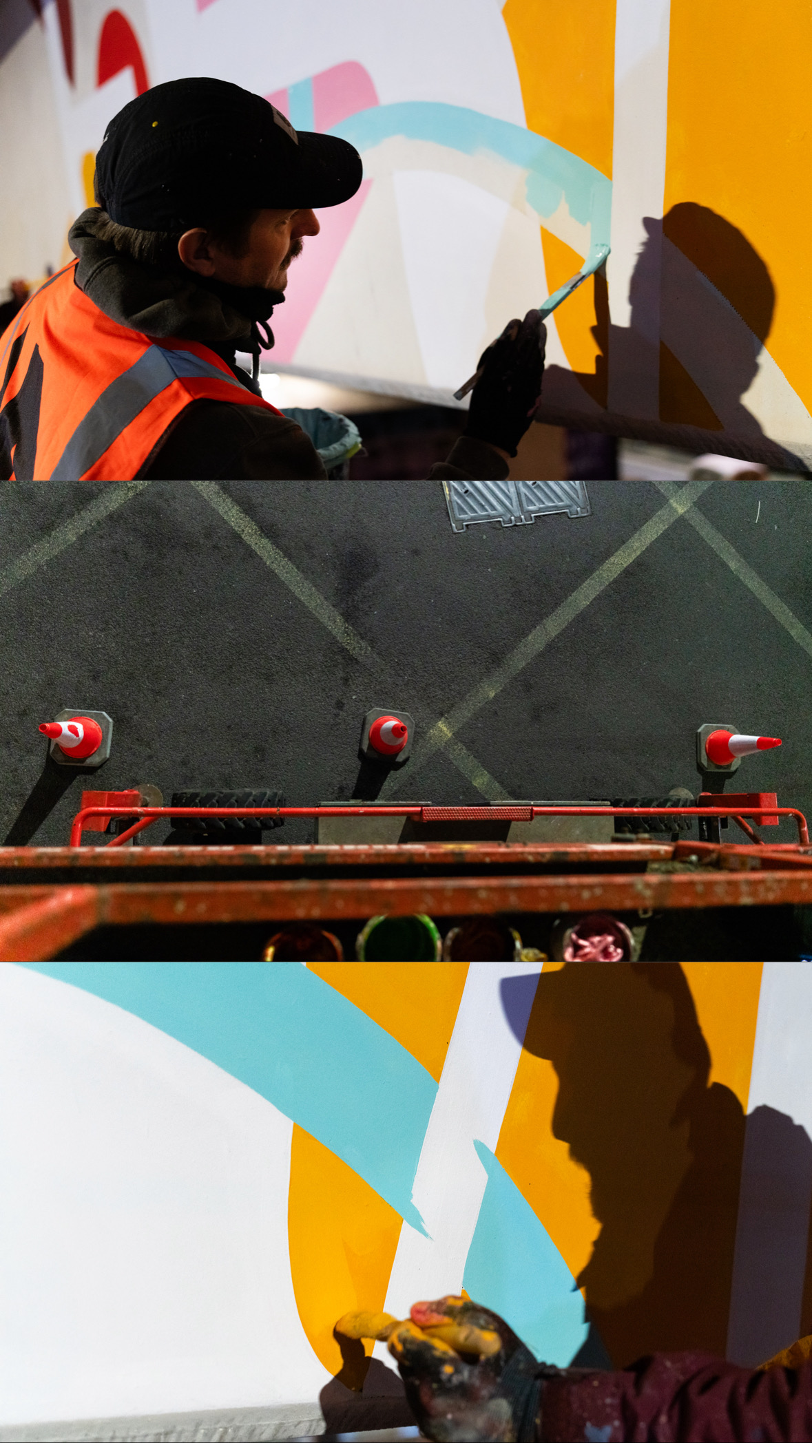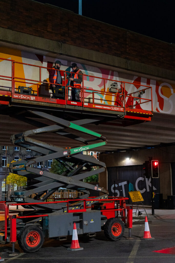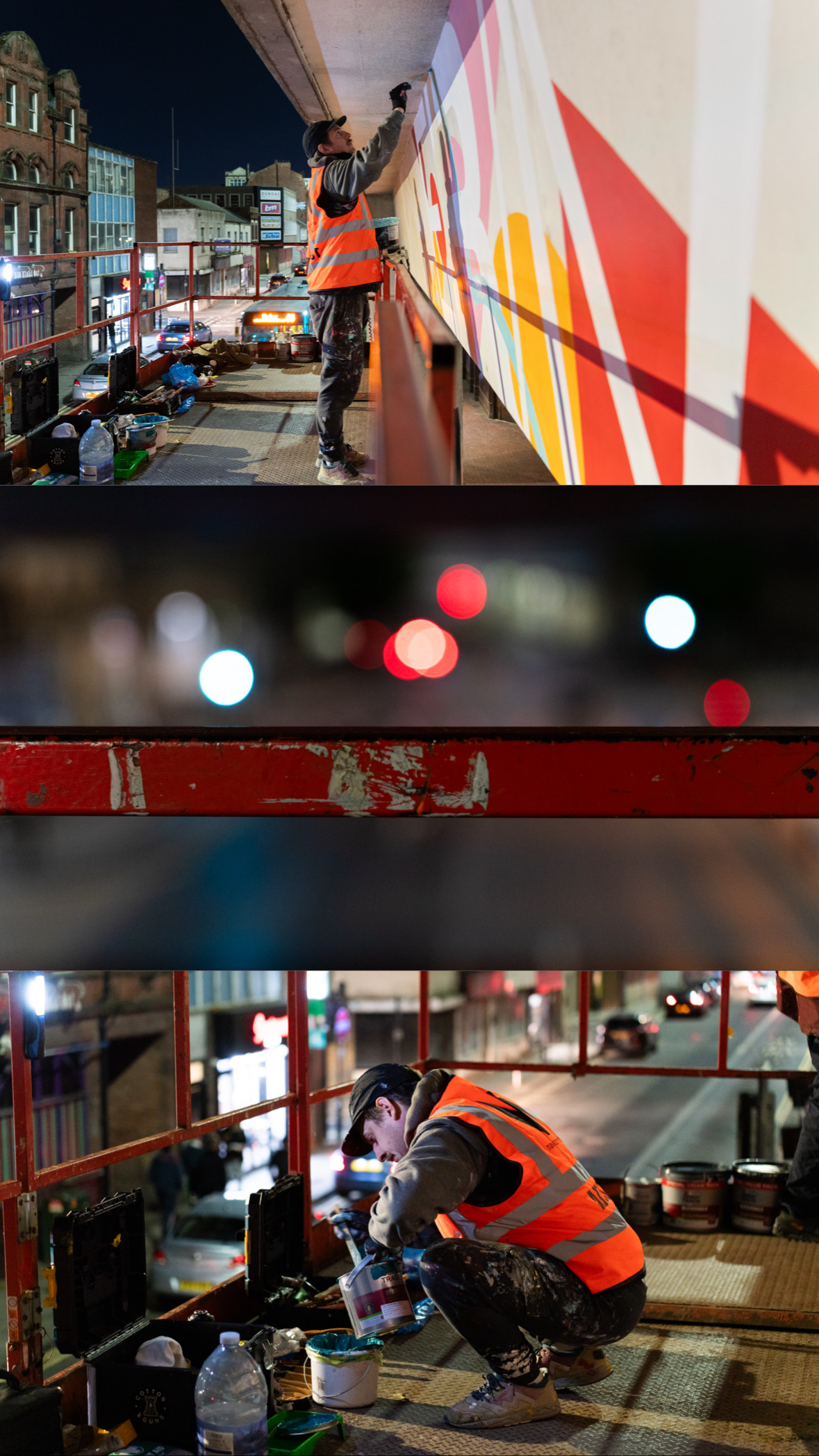 Painting of murals underneath A66 flyover, created by Nic Golightly