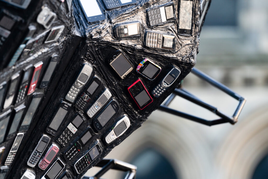Incorporating publicly donated, defunct mobile phones, the sculpture invites you to consider the emotional and physical effects of a life lived through a screen.
